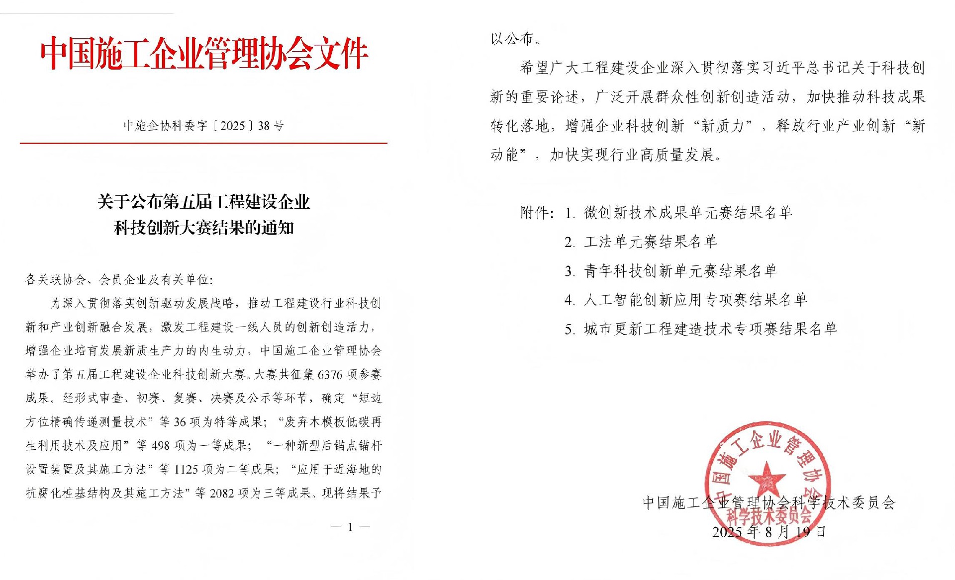 近日,第五屆全國工程建設(shè)企業(yè)科技創(chuàng)新大賽獲獎(jiǎng)結(jié)果出爐,集團(tuán)在“青年科技創(chuàng)新單元賽”中斬獲一等成果,在“工法單元賽”中獲得二等工法2項(xiàng), 三等工法1項(xiàng)。···
